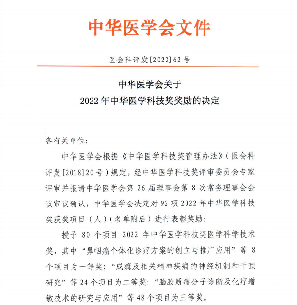 “中华医学科技奖”是中华医学会面向全国医药卫生行业设立的科技奖,该奖项对提高中国医学科技创新能力和科技水平,推广和普及先进医学科学技术,激励科技人员攀登科技高峰起着重要的促进作用。